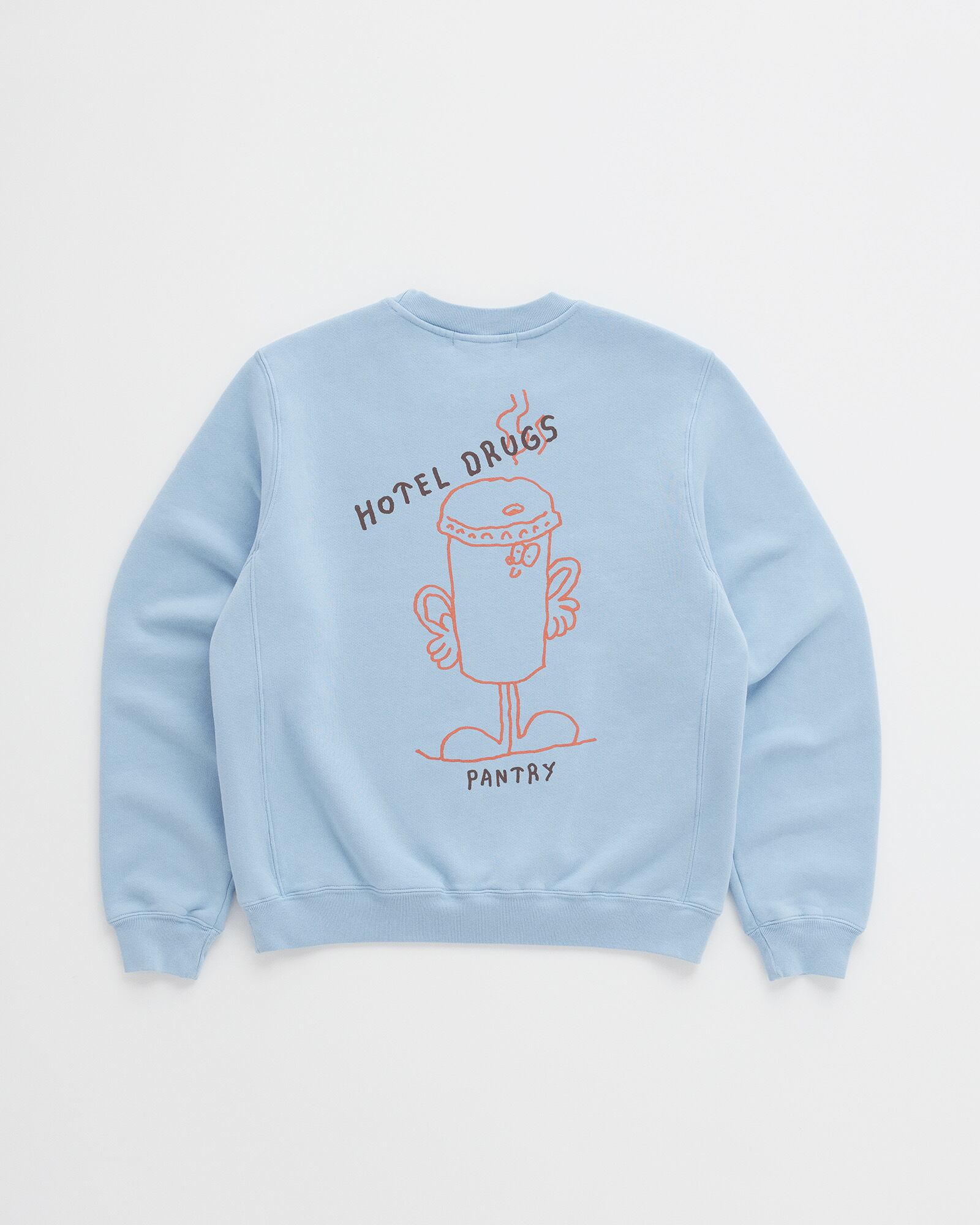 Our HOTEL DRUGS Fleece Crewneck. Premium combed cotton. Ribbed cuffs & hem. Inset side panel. HOTEL DRUGS for Pantry logo front & back print. Made in Los Angeles. All Store Exclusive Products Are Final Sale.